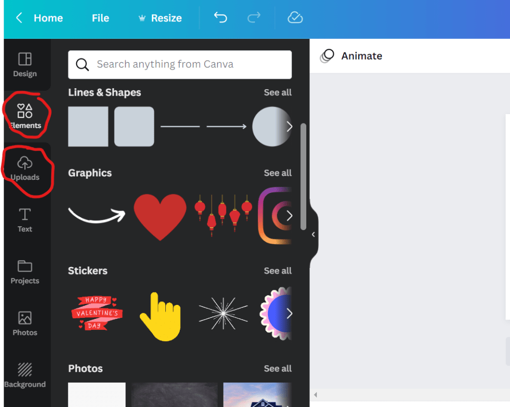 Use Elements to search for interesting graphics or stock photos to add flair to your design. Use Uploads to upload photos. Any other button on the left toolbar is fair game, but these are the ones you’ll use the most.