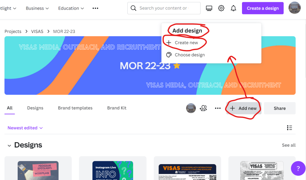 When you are in the MOR 22-23 Canva folder, use the “Add new” button. Click “Add design” then “Create new” to start a new design from scratch.