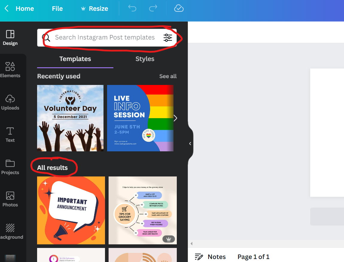 Search for templates to get a starting point for your design. There are THOUSANDS of templates. Avoid recently used templates. Find something original!