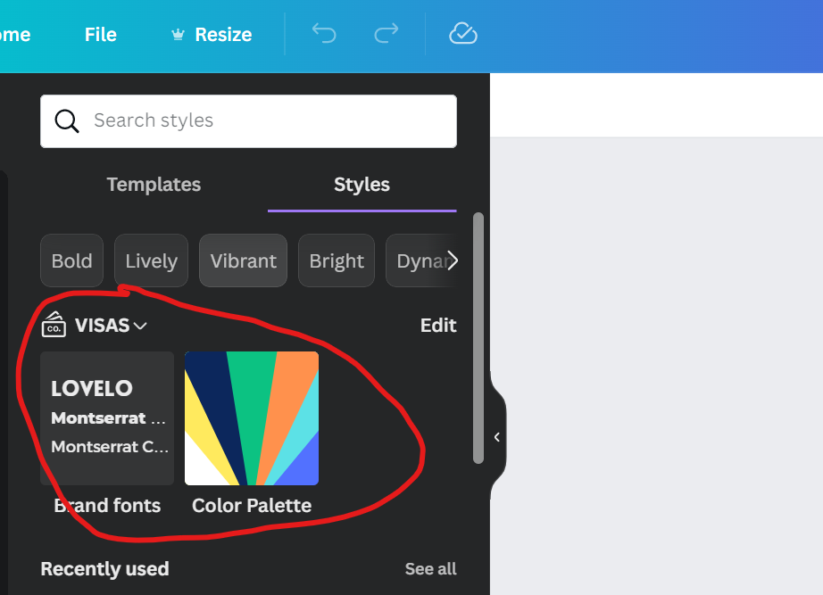 In Styles, find the VISAS brand kit: fonts and colors. Click these buttons to automatically apply VISAS fonts and colors. Use mostly these fonts and colors, but don’t feel 100% confined to them. Click the color button multiple times to see the colors applied to the design in various ways.