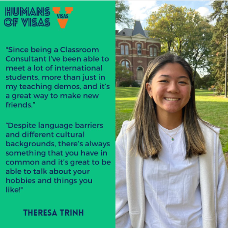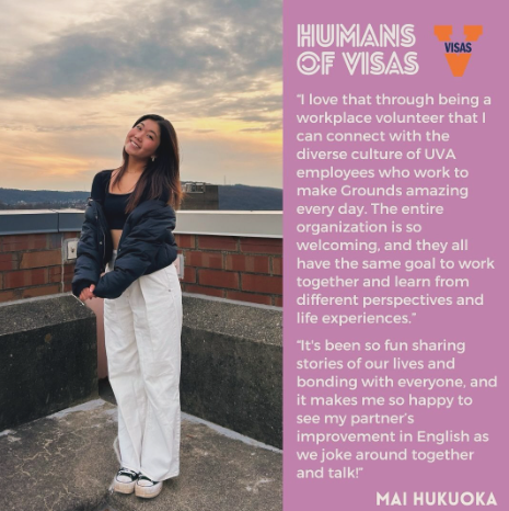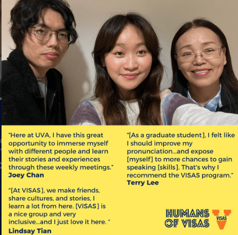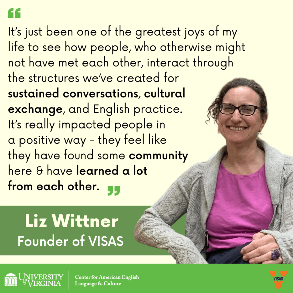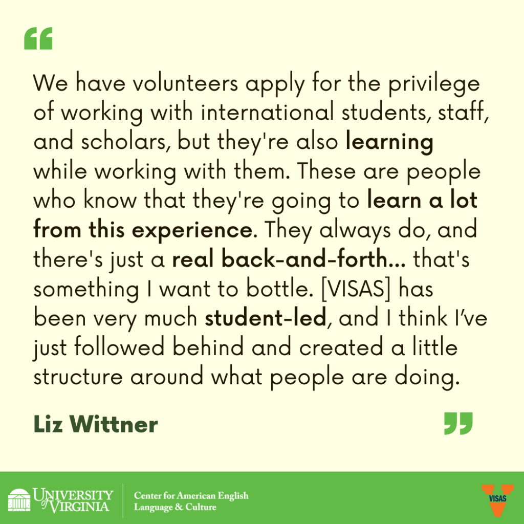 For our last Humans of VISAS post of the semester, we’d like to highlight someone very special – Liz Wittner, founder of VISAS! Liz started the program in 1999(!) when she began working at UVA with the international TA program. She is currently the Academic Director at the Center for American English Language and Culture (CAELC) and the Coordinator of the International Teaching Assistant Training Program. She truly enjoys every aspect of VISAS, and she’s excited to see how the program will continue to grow in the future!