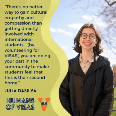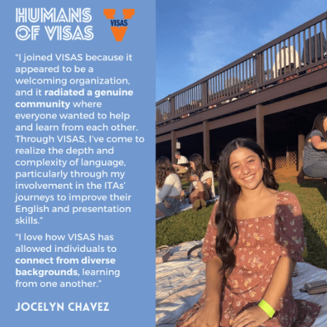 Elsa Thompson is our new and amazing VISAS Program Assistant! She also works with the Multilingual Outreach Volunteer Effort (MOVE) Program and the Center for American English Language & Culture’s (CAELC) testing and volunteer programs. She loves working with students and ESL learners and helping out with different programs of VISAS!