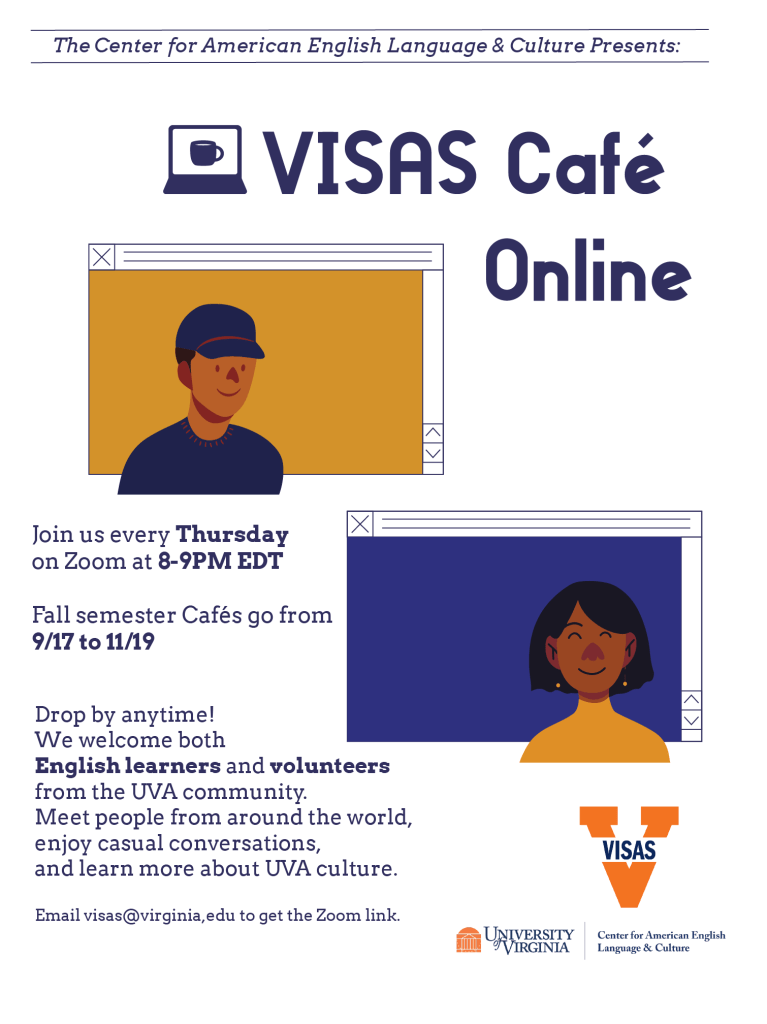 VISAS Cafe will be held every Wednesday 5:00-6:00pm in The Language Commons New Cabell Hall 298 from Wednesday, February 12th thru April 22nd *excluding March 11th Spring Break*